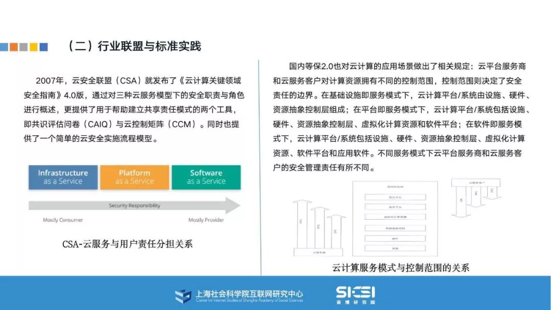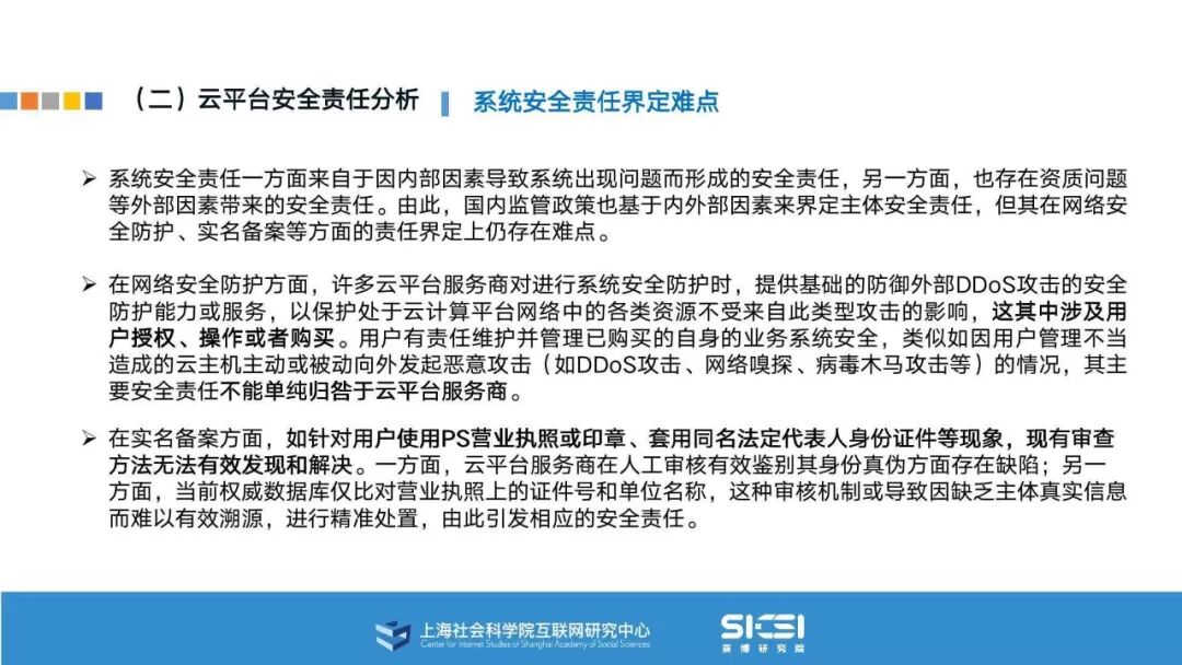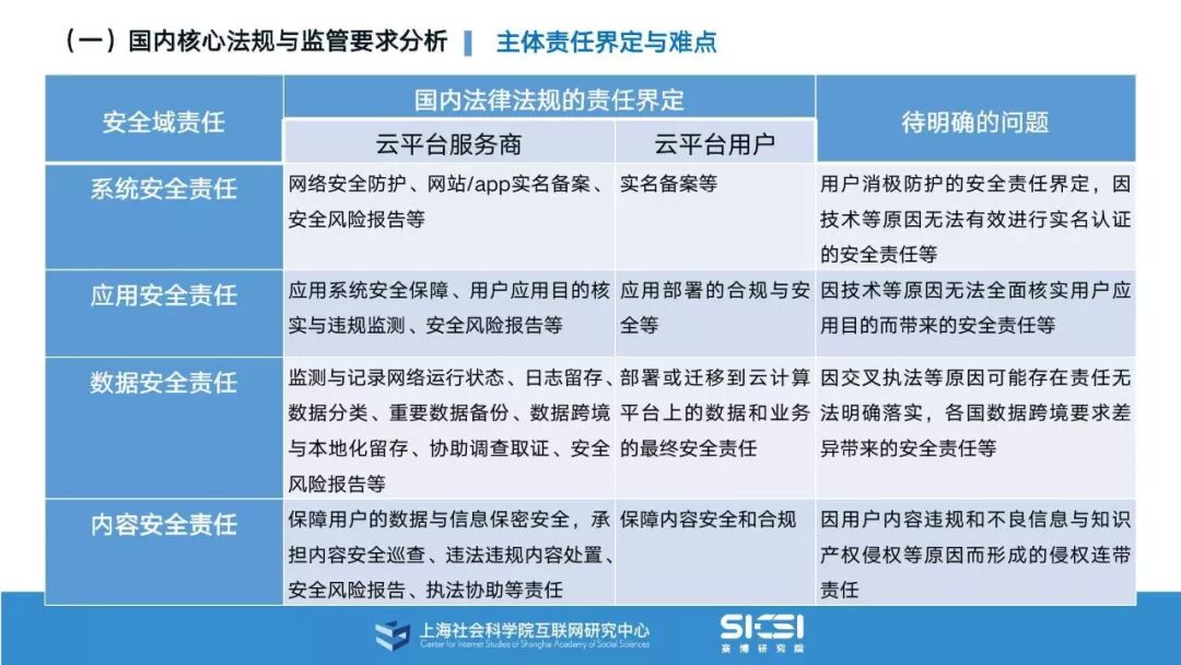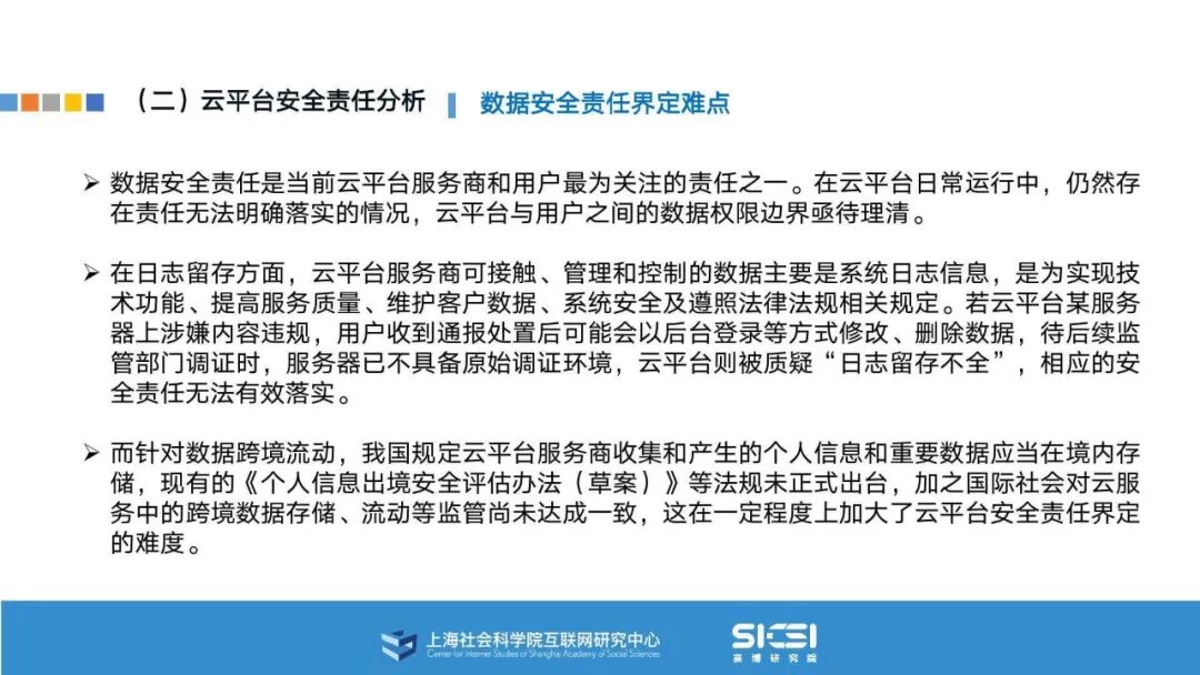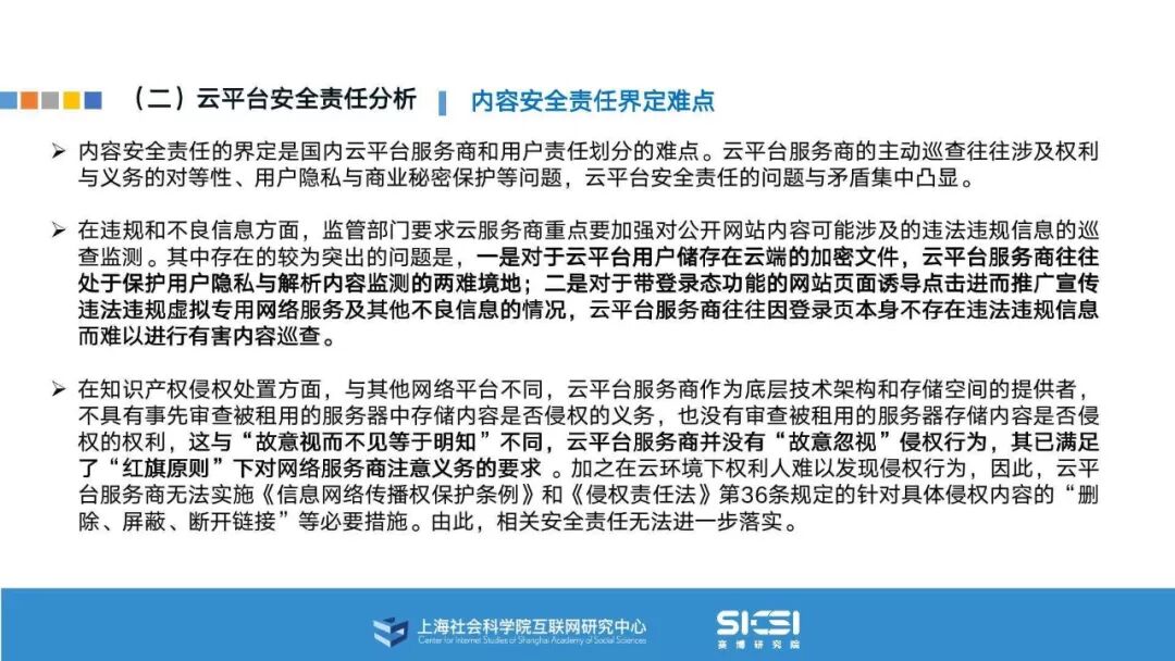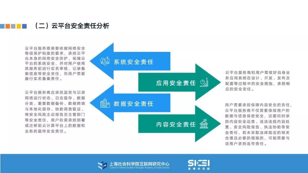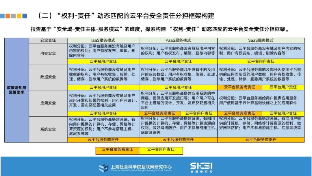 在此背景下,上海社会科学院互联网研究中心和赛博研究院联合发布《云平台安全责任与治理》报告。本报告在云平台的系统安全、应用安全、数据安全及内容安全等安全风险视域下,结合国内外的法律法规以及产业实践,界定云平台安全的责任主体与相关责任,并提出了 “权利-责任”动态匹配的云平台安全责任分担框架。