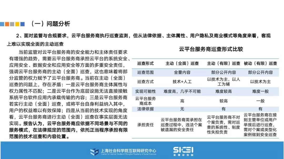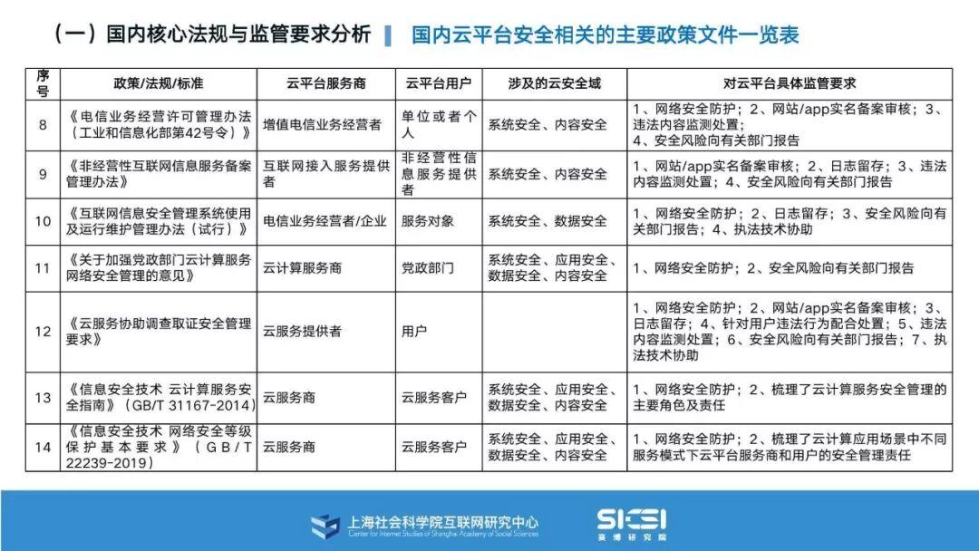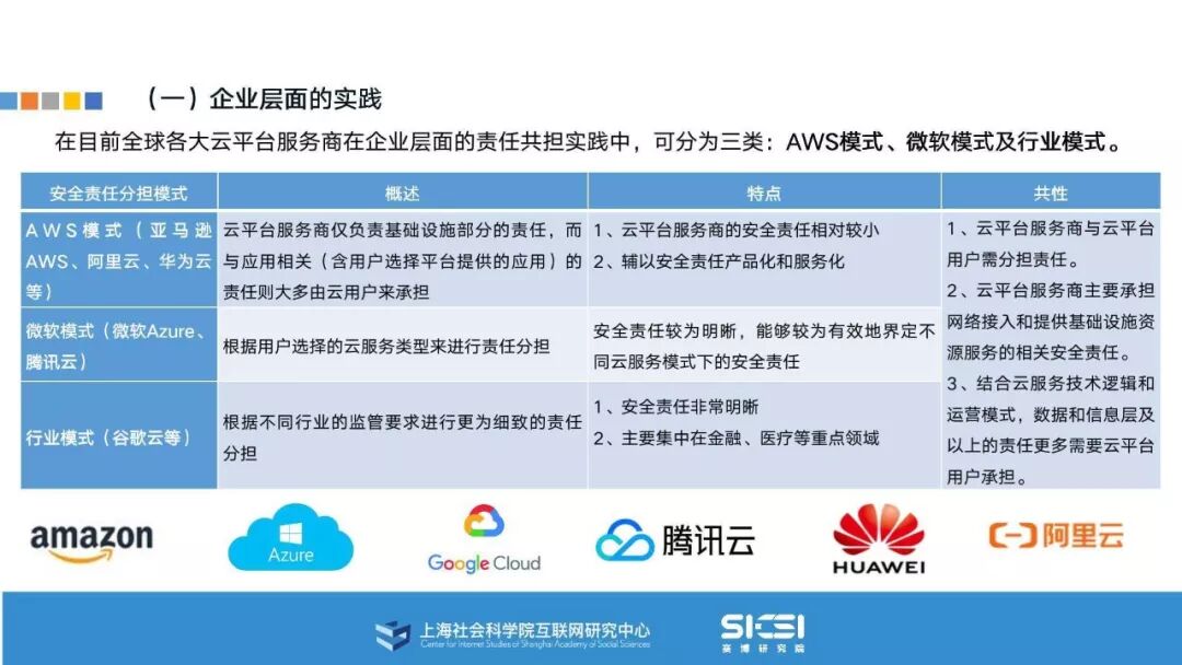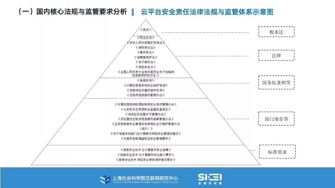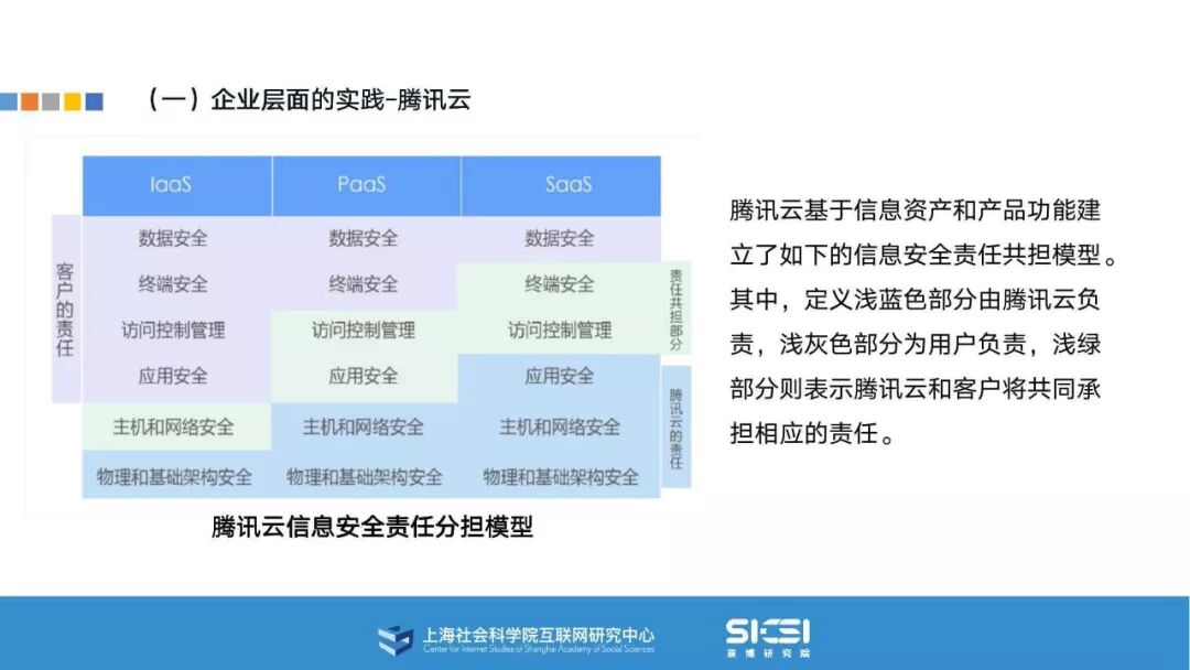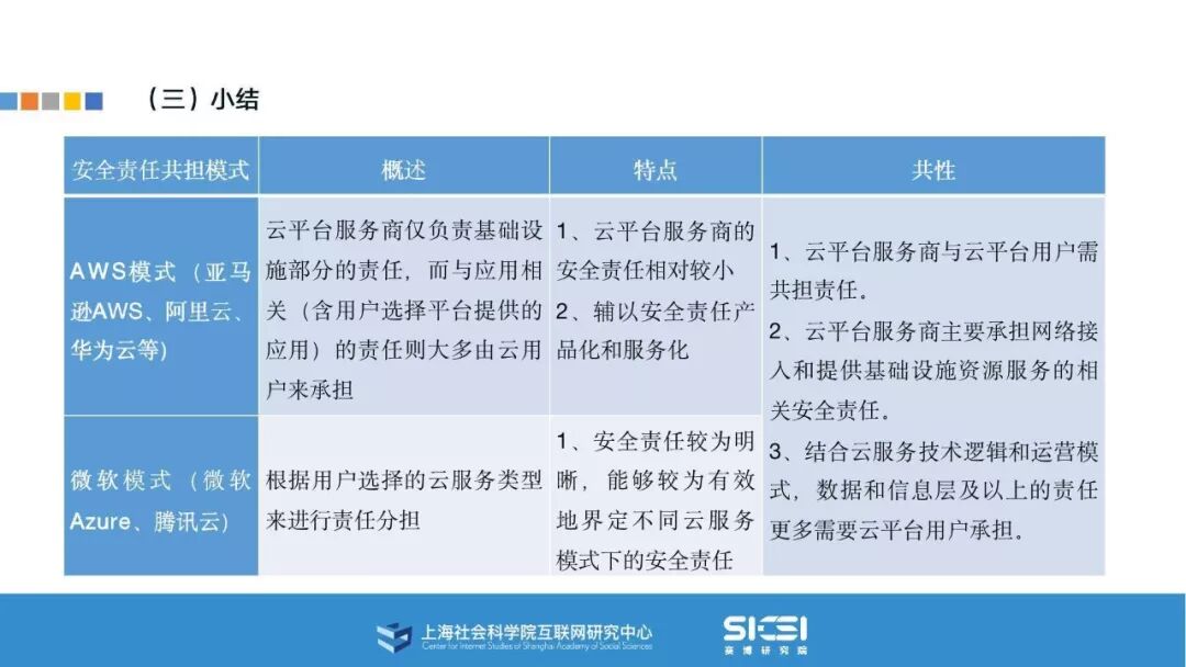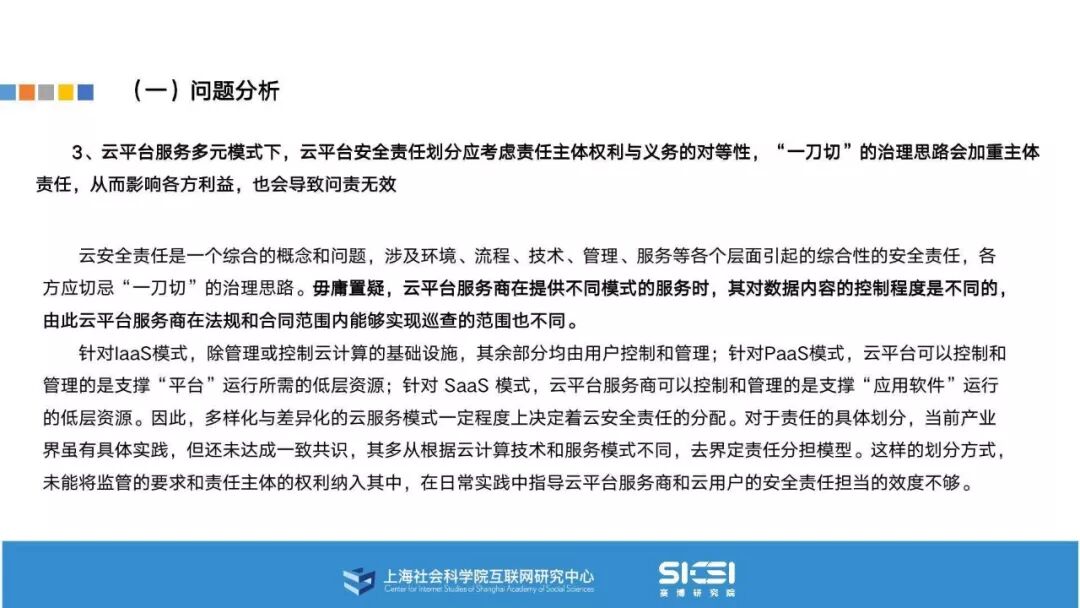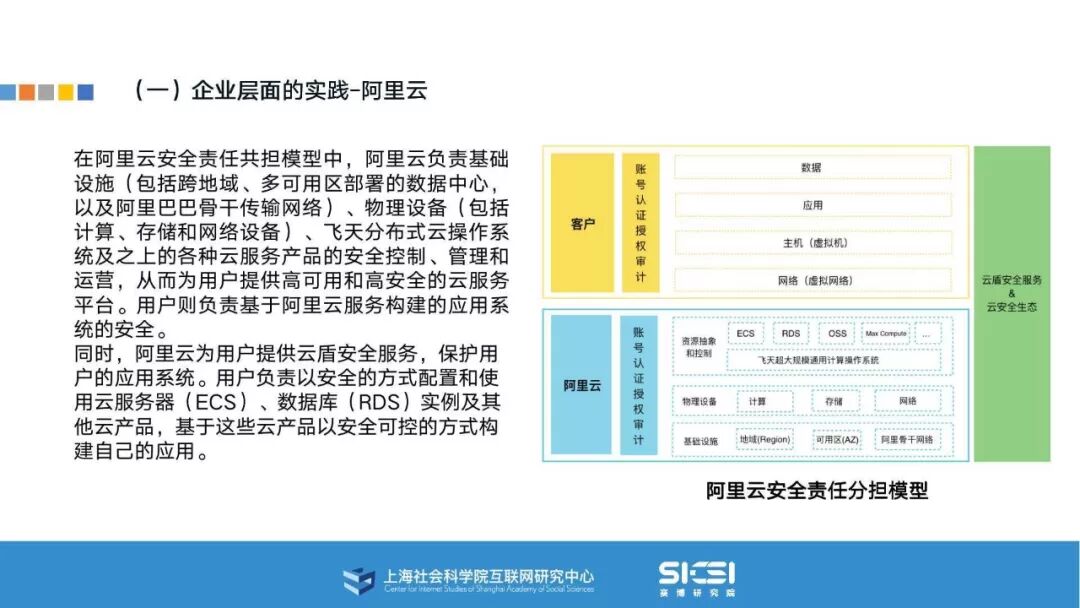 在此背景下,上海社会科学院互联网研究中心和赛博研究院联合发布《云平台安全责任与治理》报告。本报告在云平台的系统安全、应用安全、数据安全及内容安全等安全风险视域下,结合国内外的法律法规以及产业实践,界定云平台安全的责任主体与相关责任,并提出了 “权利-责任”动态匹配的云平台安全责任分担框架。