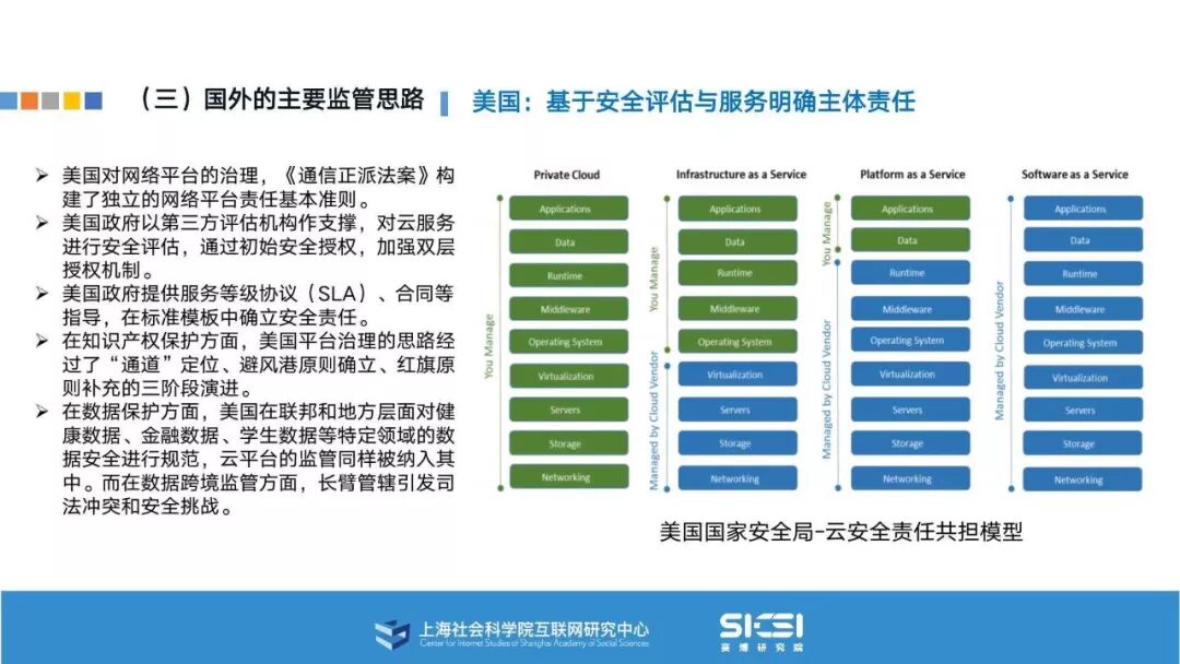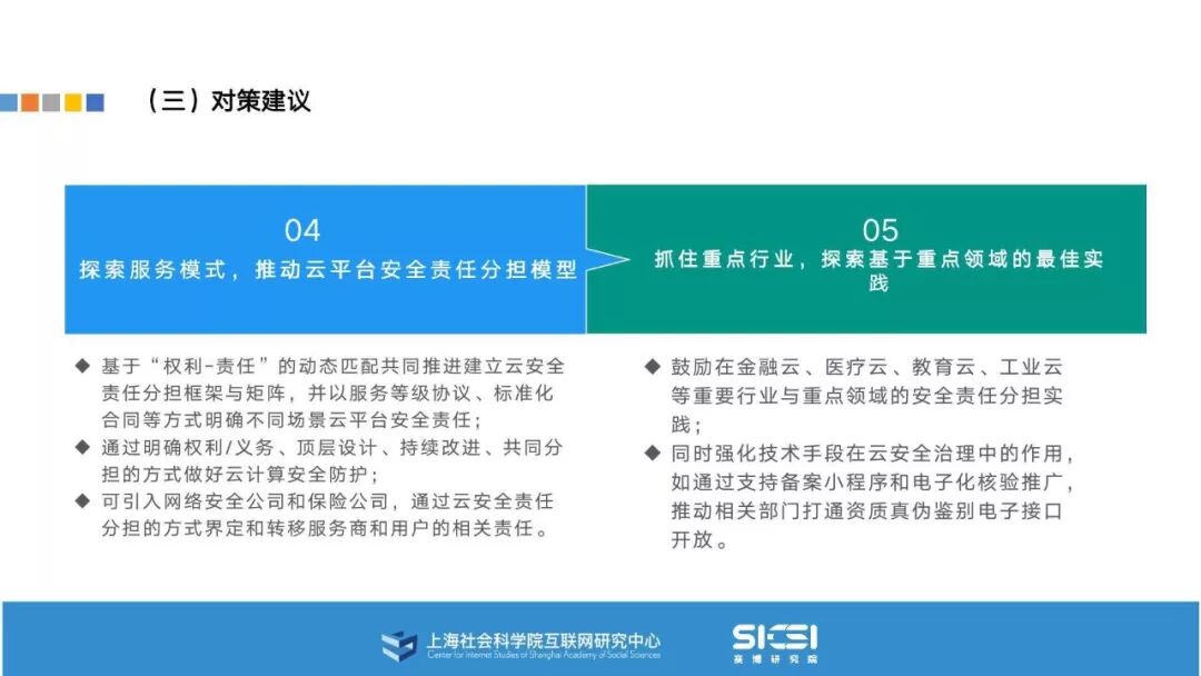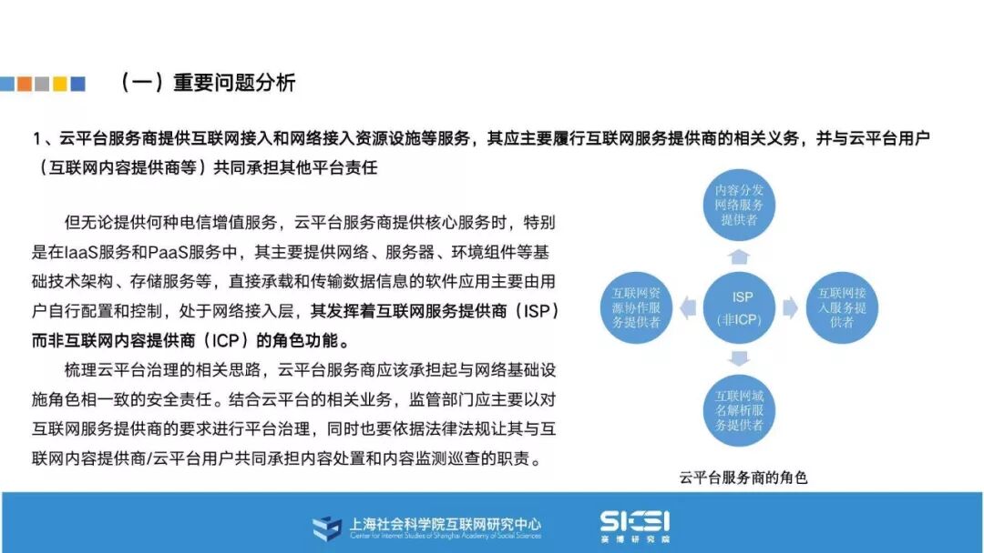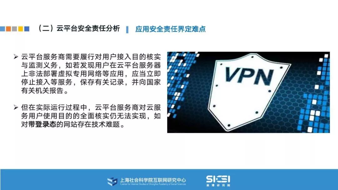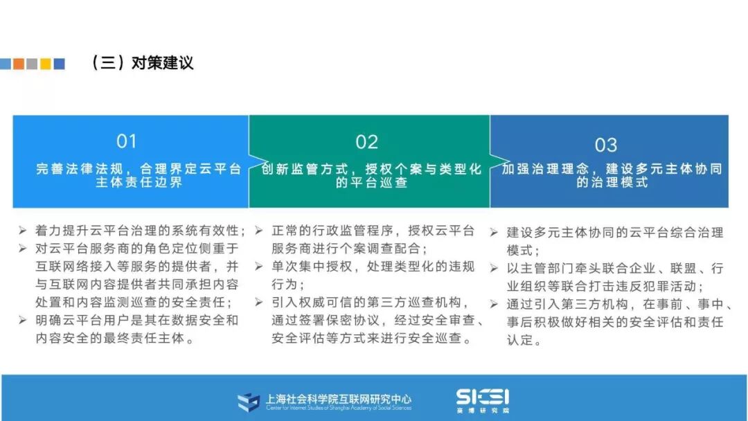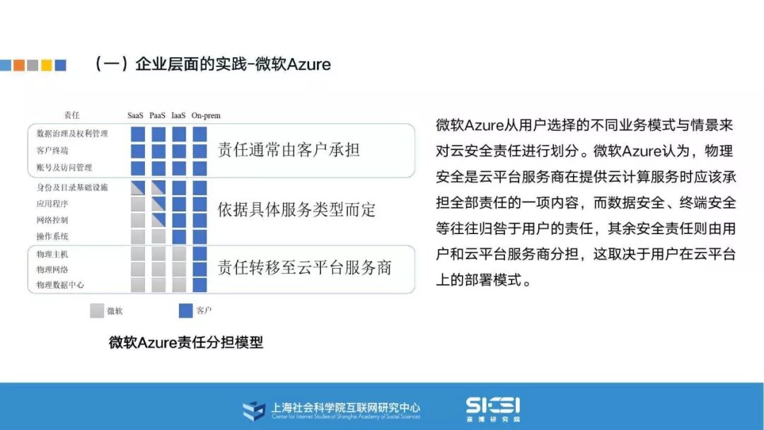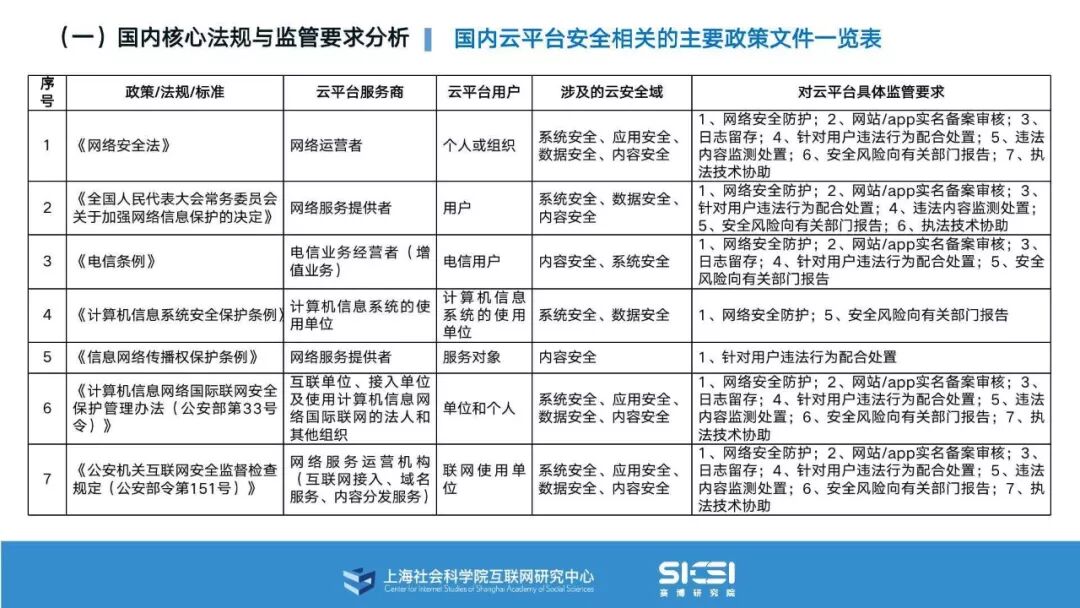 在此背景下,上海社会科学院互联网研究中心和赛博研究院联合发布《云平台安全责任与治理》报告。本报告在云平台的系统安全、应用安全、数据安全及内容安全等安全风险视域下,结合国内外的法律法规以及产业实践,界定云平台安全的责任主体与相关责任,并提出了 “权利-责任”动态匹配的云平台安全责任分担框架。