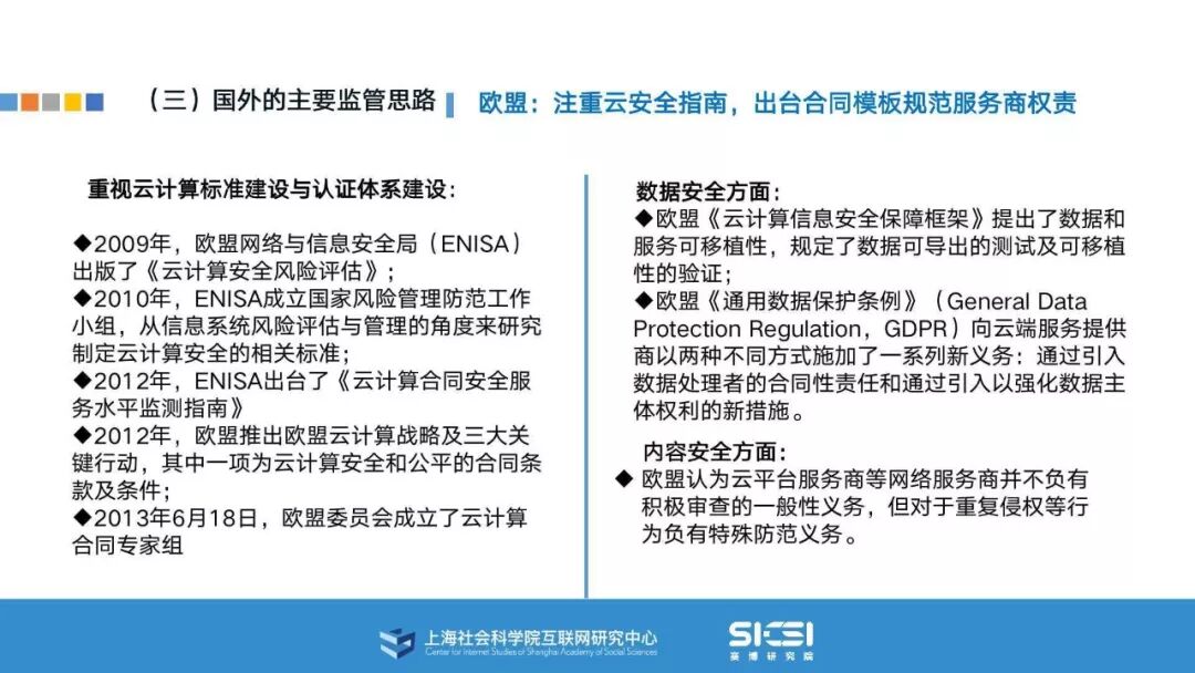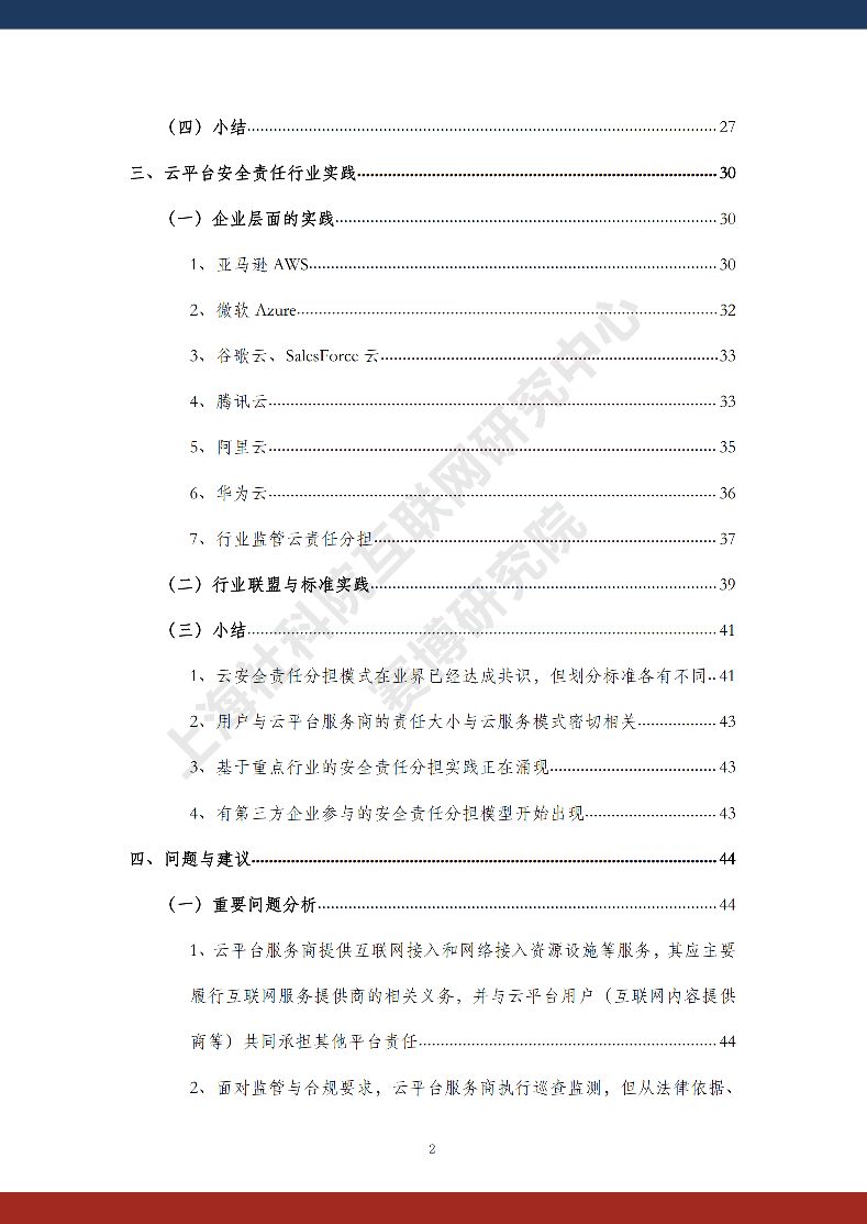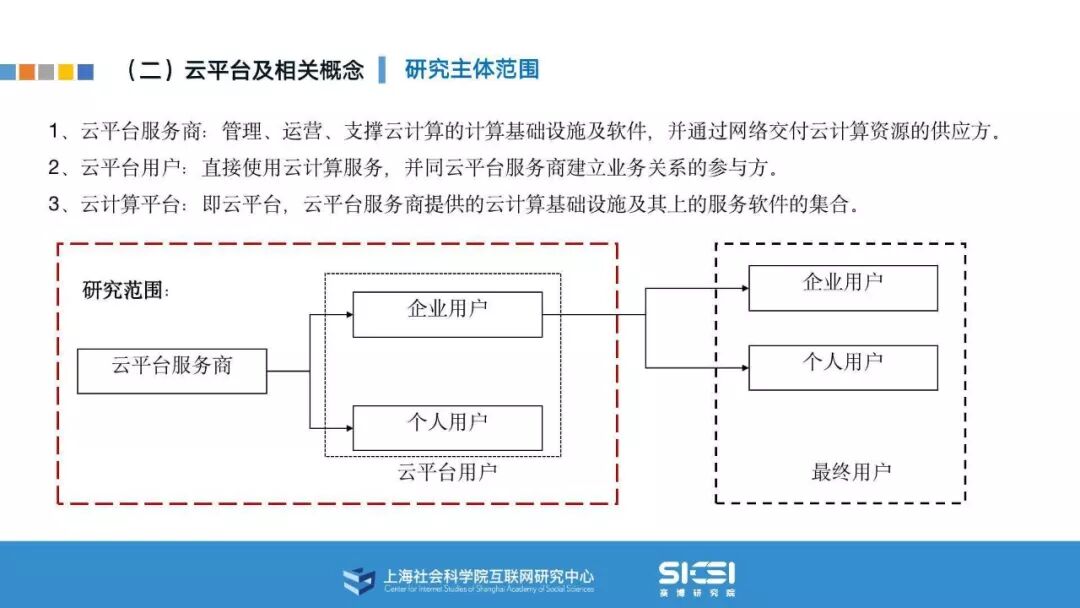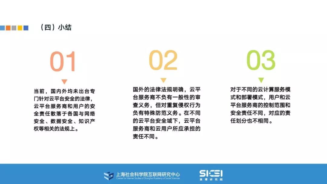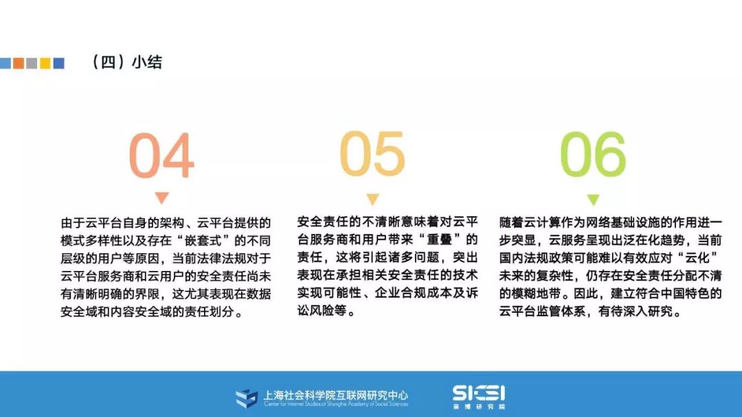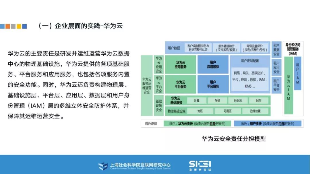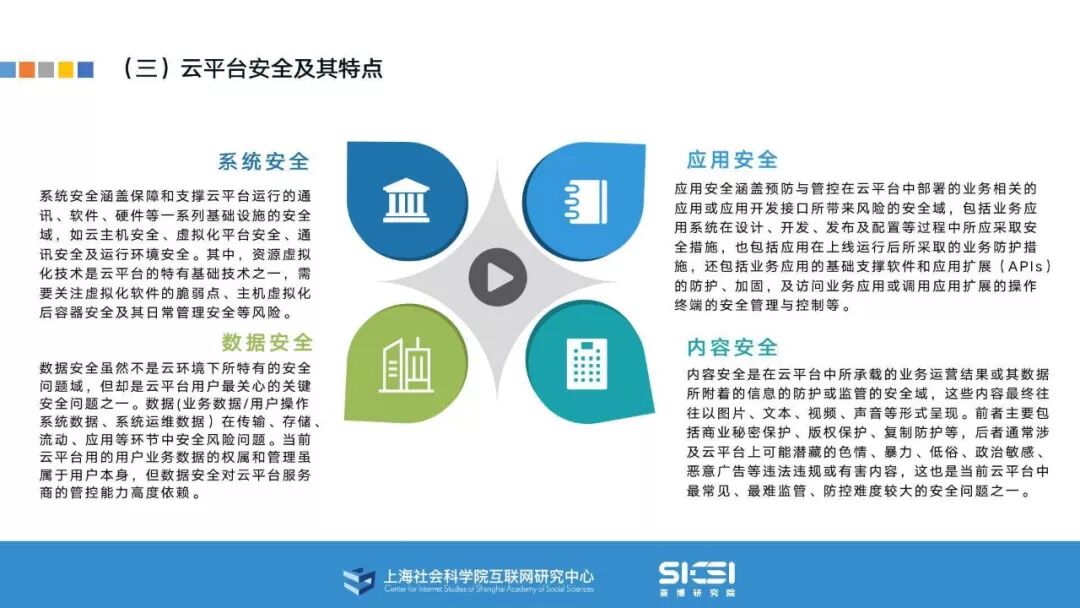 在此背景下,上海社会科学院互联网研究中心和赛博研究院联合发布《云平台安全责任与治理》报告。本报告在云平台的系统安全、应用安全、数据安全及内容安全等安全风险视域下,结合国内外的法律法规以及产业实践,界定云平台安全的责任主体与相关责任,并提出了 “权利-责任”动态匹配的云平台安全责任分担框架。