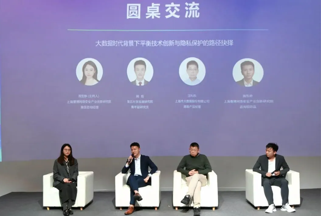 圆桌环节以“大数据时代背景下平衡技术创新与隐私保护的路径抉择”为主题,上海赛博网络安全产业创新研究院高级咨询经理周雪静担任主持人,演讲嘉宾姚旭、汪科科、施东奇等进行深入交流,并针对现场嘉宾的疑问给予详尽解答。