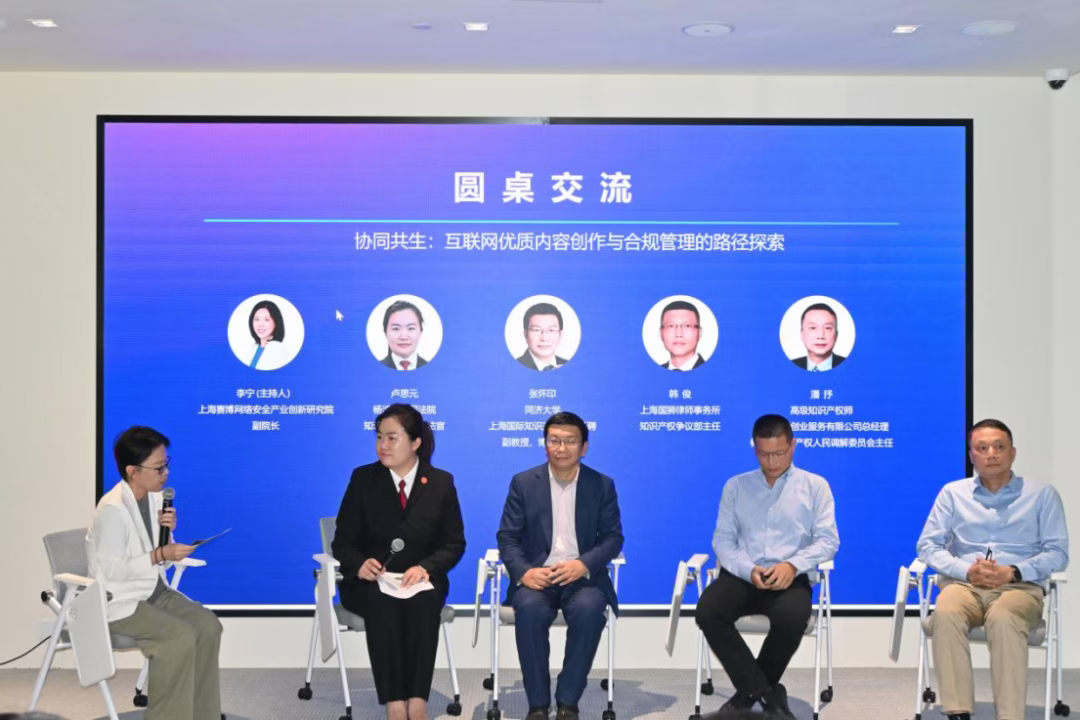圆桌讨论环节由赛博研究院副院长李宁主持,杨浦区人民法院卢思元法官、同济大学张怀印副教授、上海国狮律师事务所韩俊律师以及上海上理创业服务有限公司总经理潘抒共同参与。嘉宾们围绕“协同共生:互联网优质内容创作与合规管理的路径探索”展开深入交流,提出在技术快速迭代的背景下,亟需构建多方协同的治理体系:司法层面应通过精细化审判明确平台责任,探索AI生成内容的权利认定规则;创作者应树立“创作即固证”意识,善用新型存证工具;公共服务机构则应扮演“全科医生”角色,为企业提供全链条知识产权指导。唯有实现司法、行政执法与多元调解的有机衔接,才能构建既保护创新又促进发展的健康生态。