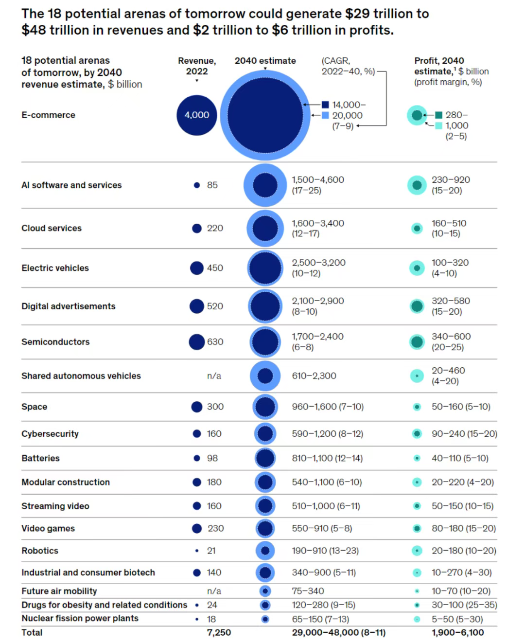 在全球经济增长动力转换的背景下,麦肯锡发布一份题为《下一个大型“竞技场”》(The next big arenas of competition)的报告。报告以“高增长+高动态性”为核心标准,界定出18个未来“竞技场”,这些领域预计将在2040年贡献29万亿至48万亿美元的营收。