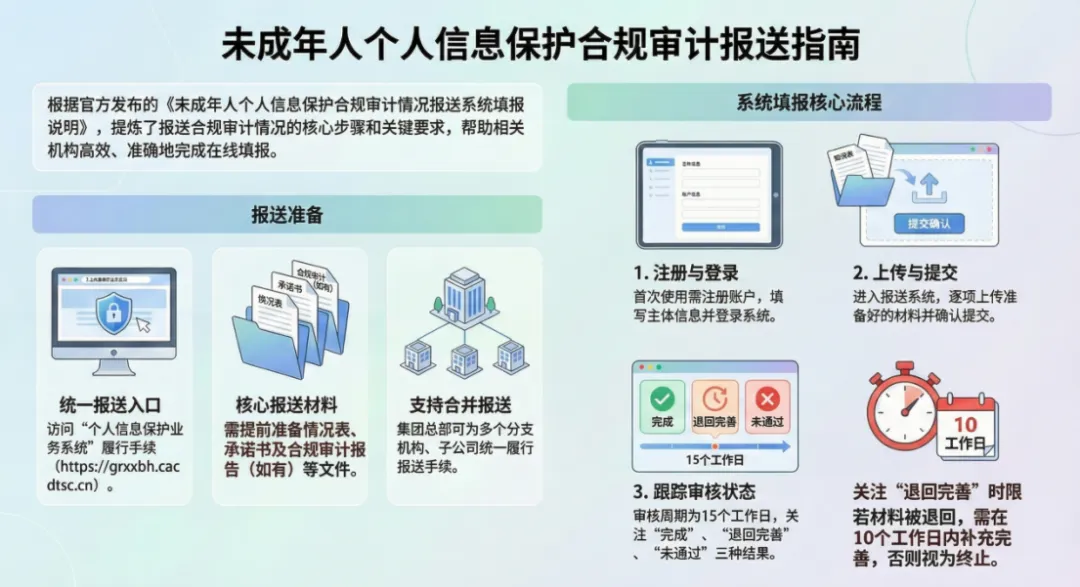 本文将结合《个人信息保护法》《未成年人网络保护条例》《个人信息保护合规审计管理办法》《关于报送未成年人个人信息保护合规审计情况的公告》《未成年人个人信息保护合规审计情况报送系统填报说明(第一版)》《网络安全实践指南——个人信息保护合规审计要求》(TC260-PG-20255A)六项法律规范文件及实践指南要求进行解读。