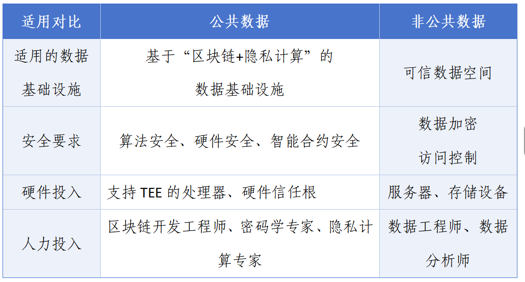 上表是基于“区块链+隐私计算”的数据基础设施,与可信数据空间的对比。二者在隐私功能、硬件与人才投入、开发周期上均存在较大差异。综上,经地方政府授权的公共数据授权运营机构适用基于“区块链+隐私计算”的数据基础设施,银行等金融机构由于IT人才与资金投入预算充足、持有的个人数据体量较大,同样适用基于“区块链+隐私计算”的数据基础设施。中大型企业根据隐私合规的要求与IT预算,可选择可信数据空间作为数据基础设施,构建多方互信的数据流通利用环境,协同上下游企业开放共享高质量数据资源。