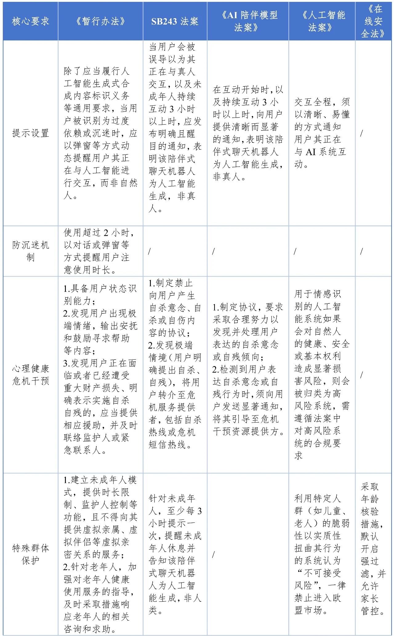 通过对全球主要国家或地区监管实践的横向对比可以看出,针对陪伴型AI,不同司法辖区在监管路径、规则设计、执行力度、救济方式等方面虽有不同,但在核心关切上呈现出高度趋同之势。