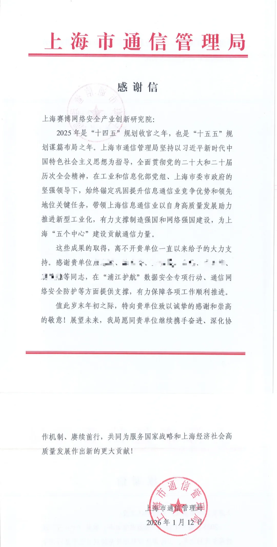 1月12日,上海赛博网络安全产业创新研究院(下称 “赛博研究院”)收到来自上海市通信管理局的感谢信。信中对赛博研究院在 “浦江护航” 数据安全专项行动、通信网络安全防护等工作中的扎实支撑与突出表现,予以高度肯定。